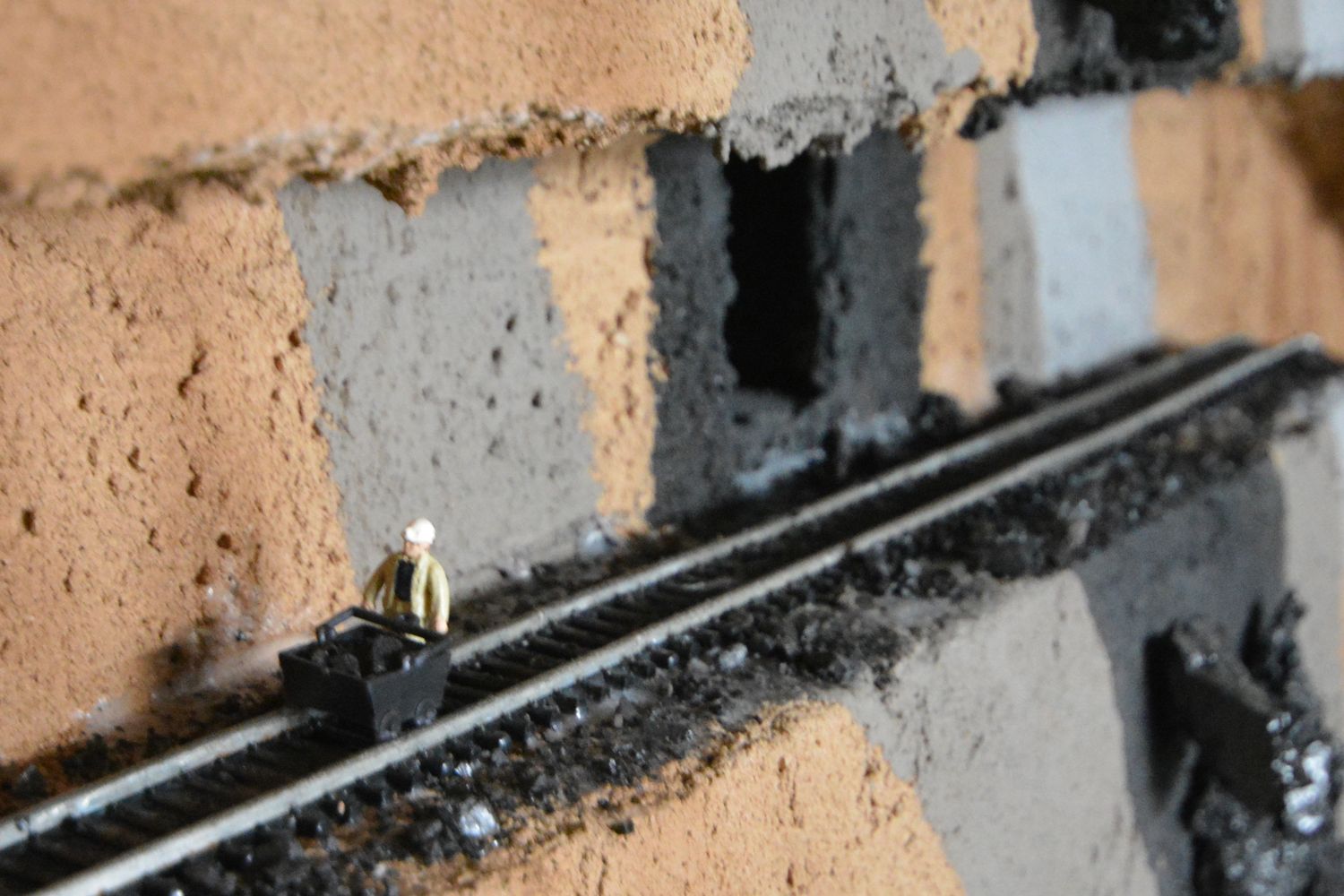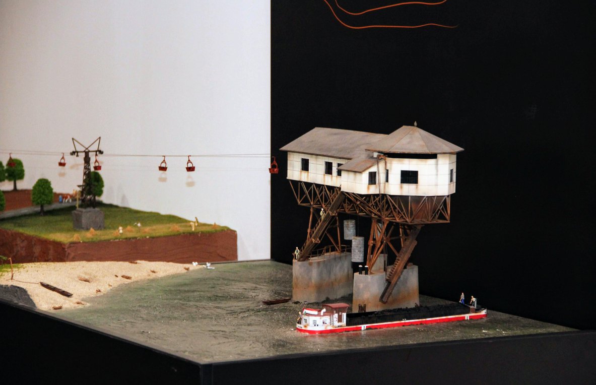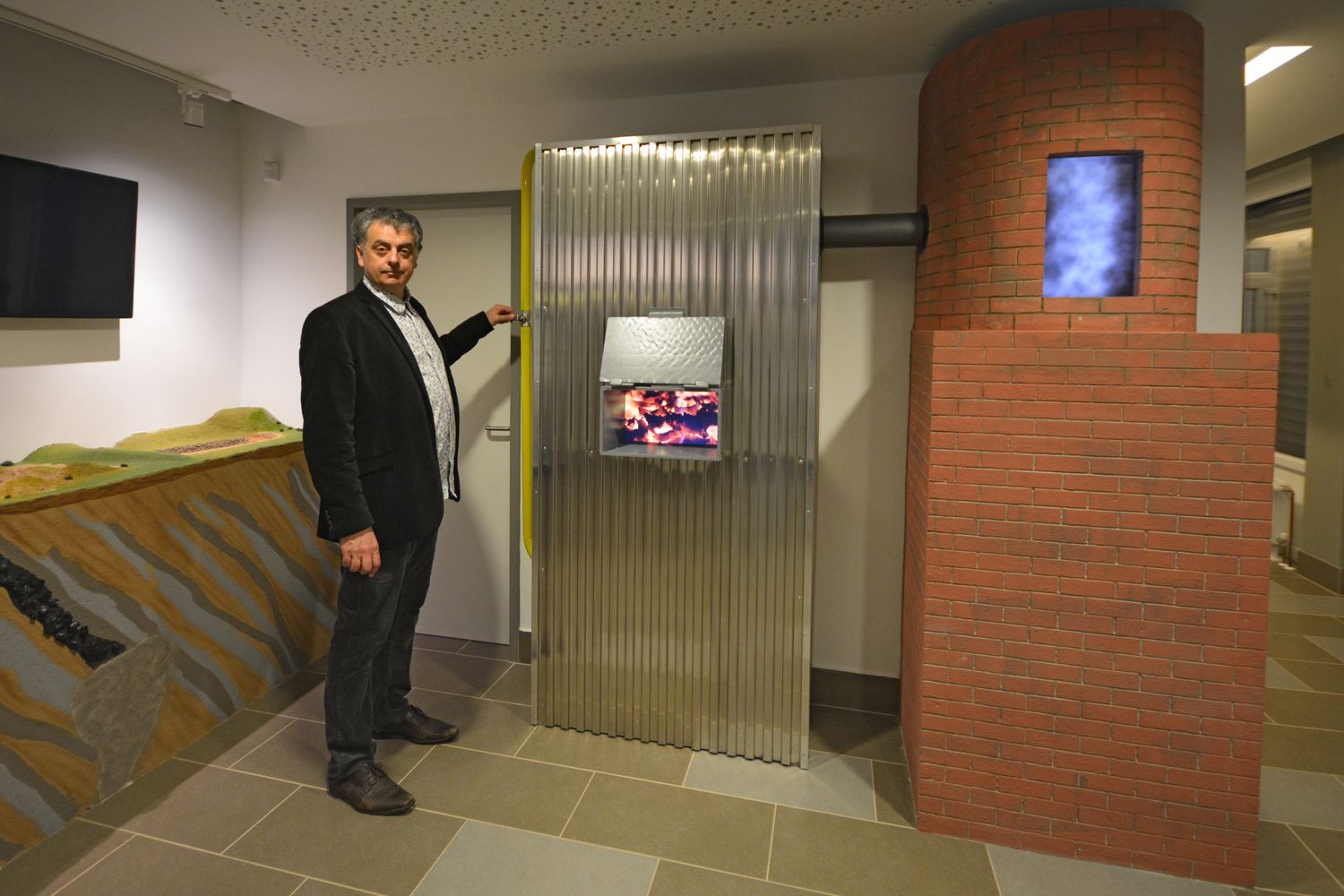 A szénfűtésről a gázfűtésre átállás szimulációja. Egy kar elforgatásával induló animációs rendszer kazán és kémény makettbe építve. Pécs, Zöld Zóna Látogatóközpont.