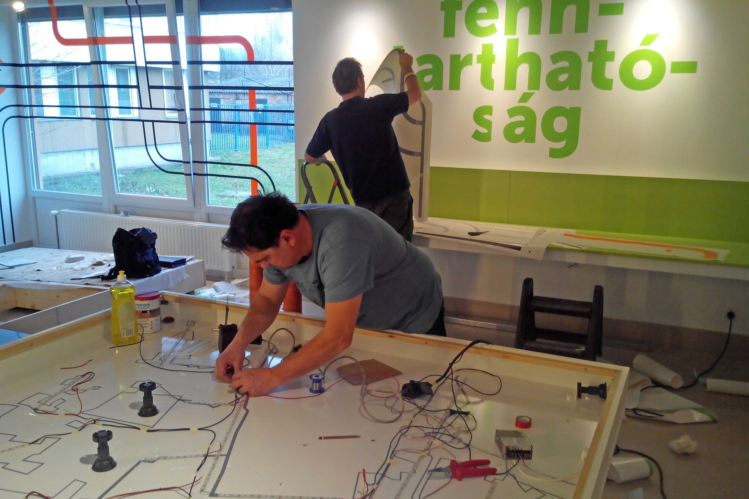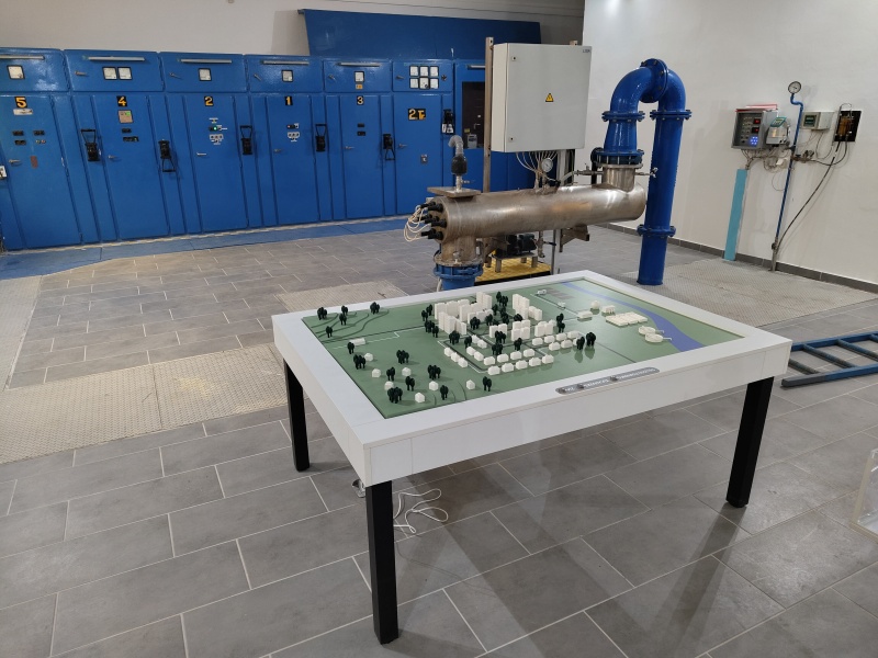 A Heves Megyei Vízmű Zrt., „víziközmű-szolgáltatással kapcsolatos szemléletformálás” elnevezésű projektjéhez járultunk hozzá ezzel a kis makettel. A tipizált városmodell a víz és szennyvízhálózat áramlásást, kezelését, majd a természetbe való visszajuttatását szemlélteti. Bár lehet nem tűnik annyira bonyolultnak, mint amit általában szoktunk készíteni, mégis nyolc ember munkája van benne. A modell Eger város műemléki védelem alatt álló vízmű gépházában lett kiállítva, ahonnét amúgy a város jelentős részének ellátása történik mai is.